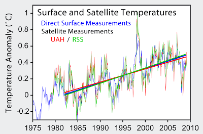 No entanto, sou menos pessimista que ele quanto à Conferência de Copenhague e aos seus preparativos. Como o Presidente Obama, penso que será sempre um grande progresso político a Humanidade entender-se para resolver um problema comum. Se haverá um progresso climático, não sei, mas o próprio consenso político, a atingir-se, vale a pena destes esforços, porque o grande problema da Humanidade não é o clima - é o próprio Homem! Como os negacionistas do Aquecimento Global são incansáveis na defesa das suas posições e me enviam imensos comentários, mas o meu programa de blog não passa por colocar esse tema no seu centro, anexo a figura acima que mostra as medições feitas pelos satélites da NASA para "remote sensing" do clima do planeta, sobre a temperatura da nossa atmosfera. Encontra-se aqui também uma boa introdução ao assunto para os interessados em se iniciarem no tema.